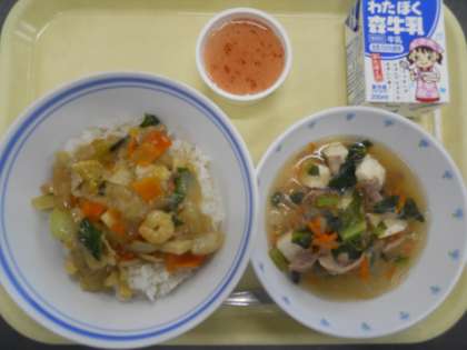 中華丼には10種類の食材が使われています。トロミがついているので冷めにくく、寒い時期に適したメニューですね。海老は低カロリーでたんぱく質で、カルシウムなどのミネラルも豊富です。アスタキサンチンという赤い色素を含み、抗酸化作用があります。