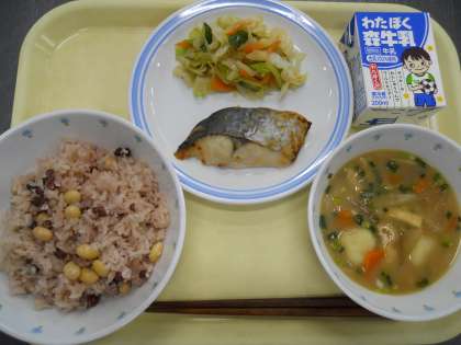 今日は熊本県の郷土料理です。「つなひきよいしょ」は、どんな料理なのか?と思われると思いますが、熊本県山鹿市に伝わる民話から考えられたご飯で、大豆と小豆が入ったおこわです。5月の「給食だより」にも載せています。