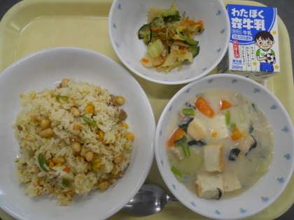 <献立>大豆ピラフ あすかチャウダー じゃこのカリカリサラダ