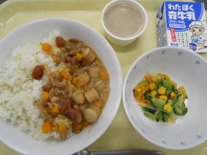 今日のテーマは「ブラジル料理」です。フェジョアーダは、黒いんげん豆とソーセージや豚肉を煮込んで塩で味つけた料理で、ブラジルの代表的なメニューです。いんげん豆にはいくつか種類があり、給食では北海道産の金時豆を使用しました。