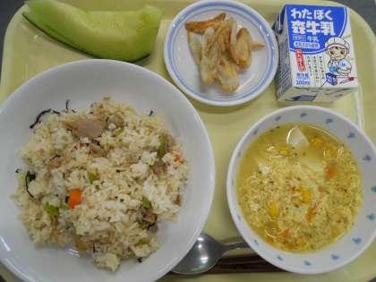 <献立>中華風炊き込みご飯 ごぼうの唐揚げ 中華風コーンスープ メロン