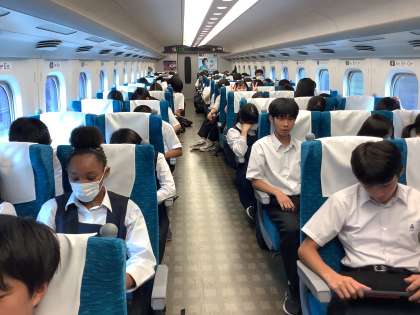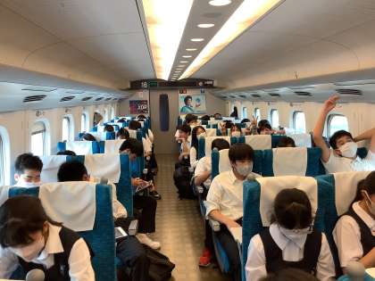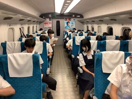 車内では友達と話したり、勉強したり、朝早かったから寝たり、それぞれ過ごしています。