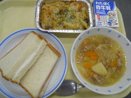 7月6日献立 公開日 2023/07/06 更新日 2023/07/06 給食 <献立>二色サンド(いちごジャム、クリームチーズ) ペンネグラタン 野菜スープ <産地>人参(埼玉県)、玉ねぎ(佐賀県)、マッシュルーム(千葉県)、いんげん(千葉県)、じゃが芋(長崎県)、セロリ(長野県)、キャベツ(長野県)、鶏肉(静岡県)、豚肉(鹿児島県) 今日はリクエスト献立で1位だった「ペンネグラタン」に、二色サンドとスープを合わせました。サンドは、いちごジャムとクリームチーズです。 いいね(0)