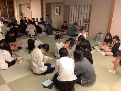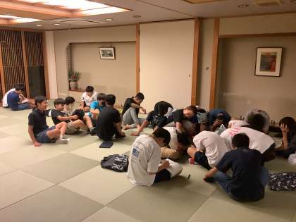 翌日のために班会議をする人、今日の記録を思い出話しながら書く人、リラックスする人、楽しいひとときを過ごしています。