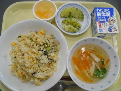 <献立>じゃこと小松菜のチャーハン  すましそうめん   青のりポテト  サイダー寒ゼリー