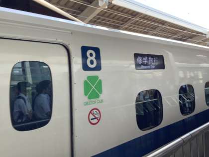 修学旅行専用の列車に乗り込み、京都を後にします。
