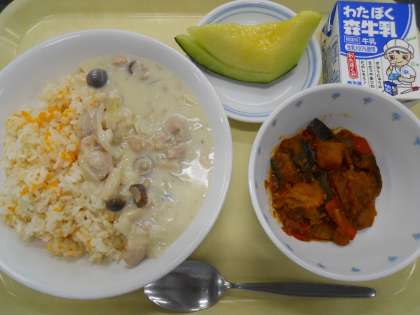 <献立>キャロットライスクリームソースかけ  ラタトゥイユ  メロン