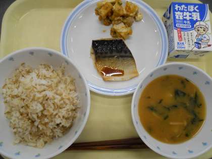 8月28日献立 公開日 2023/08/28 更新日 2023/08/28 給食 <献立>煮じゃこご飯 さばの塩焼き 生揚げのそぼろ煮 味噌汁 <産地>生姜(高知県)、玉ねぎ(北海道)、人参(北海道)、万能ねぎ(福岡県)、じゃが芋(新潟県)、えのき(長野県)、長ネギ(秋田県)、小松菜(埼玉県)、さば(ノルウェー産)、豚肉(鹿児島県) 今日のさばは脂がのっています。塩で下味をつけ、焼き上がりにレモン醤油をかけて、さっぱりさせています。 いいね(0)
