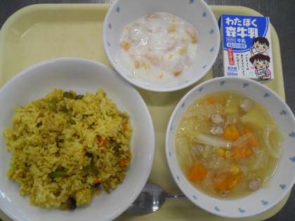 <献立>カレーピラフ  野菜スープ  フルーツヨーグルト