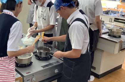 3年生は調理実習で豆腐白玉を作りました。限られた時間の中でしたが、協力することでなんとか時間内に完成させ、美味しそうに食べていました。手際よく調理する生徒や率先して洗い物を済ませる生徒など、チームワークが光る班が多々見られました。