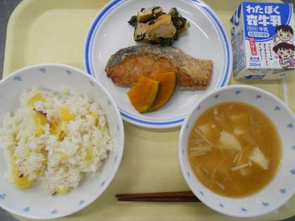 9月21日献立 公開日 2023/09/21 更新日 2023/09/21 給食 <献立>さつま芋ご飯 鮭の竜田揚げ 厚揚げと小松菜の炒め物 味噌汁 <産地>さつま芋(千葉県)、生姜(高知県)、南瓜(北海道)、小松菜(埼玉県)、じゃが芋(北海道)、えのき(長野県)、長ネギ(青森県)、鮭(北海道) 今日の献立は栄養士実習生のたてた献立で「秋が旬の食材」がテーマです。さつま芋や秋鮭、えのき、じゃが芋は秋が旬の食材です。 いいね(0)
