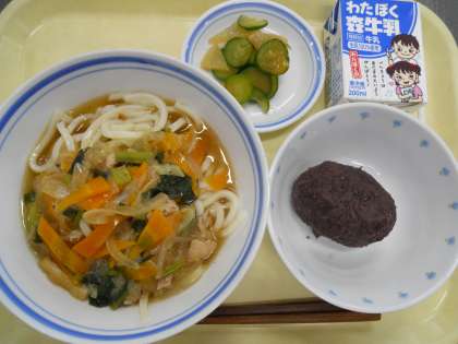 <献立>鶏南蛮うどん  きゅうりと大根の香味漬け  おはぎ