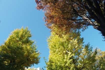 正門前の木々がやっと色づき始めています。今日は心地よい天気で、日差しに当たるととてもきれいです!