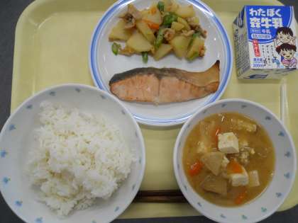 <献立>ご飯  鮭の塩麹焼き  じゃが芋と豚肉の香味炒め  呉汁