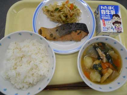 <献立>ご飯 鮭の香味焼き 味噌ドレッシングサラダ 芋団子汁