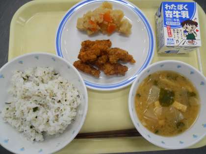 12月19日献立 公開日 2023/12/19 更新日 2023/12/19 給食 <献立>わかめご飯 いかのかりん揚げ じゃが芋の甘煮 味噌汁 <産地>じゃが芋(北海道)、人参(埼玉県)、大根(千葉県)、長ネギ(栃木県)、いか(ペルー産) いかのかりん揚げは醤油とみりんで下味をつけた後、でんぷんをまぶして揚げています。 いかは高たんぱく質、低カロリーで、コレステロールを減らす効果のある「タウリン」が豊富な食材です。 いいね(0)