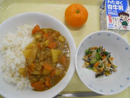 12月25日献立 公開日 2023/12/25 更新日 2023/12/25 給食 <献立>ポークカレーライス ひじきのバランスサラダ みかん <産地>にんにく(青森県)、生姜(高知県)、玉ねぎ(北海道)、人参(千葉県)、じゃが芋(北海道)、小松菜(東京都)、もやし(静岡県)、きゅうり(千葉県)、みかん(愛媛県)、豚肉(鹿児島県) いいね(0)