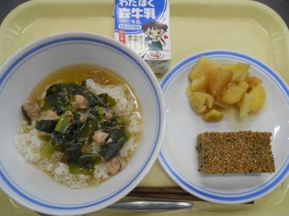 今日から給食もスタートです。今日はさっぱりしただし茶漬けと、お正月らしい献立にしました。松風焼きは、お正月料理の一つで表面にケシの実やごまを飾り、裏には何も施さないことから、「裏がない」=隠しことがなく正直な様子を表し、「今年一年、悪いことをせずまっすぐ生きていこう」と言う願いが込められています。