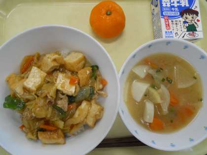 1月13日献立 公開日 2024/01/13 更新日 2024/01/13 給食 <献立> 生揚げと野菜の味噌炒め丼 根菜の味噌汁 みかん <産地>玉ねぎ(北海道)、人参(埼玉県)、ピーマン(宮崎県)、キャベツ(愛知県)、大根(神奈川県)、ごぼう(青森県)、里芋(埼玉県)、万能ねぎ(福岡県)、みかん(静岡県)、豚肉(鹿児島県)、豚肉(鹿児島県)、鶏肉(静岡県) いいね(0)