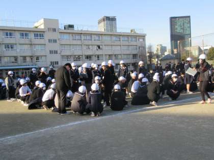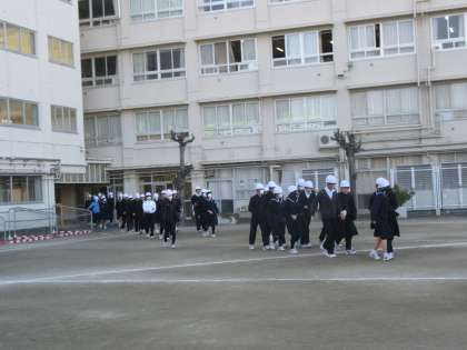 北風が強く吹く中となりましたが、スムーズに避難、点呼を完了できました。