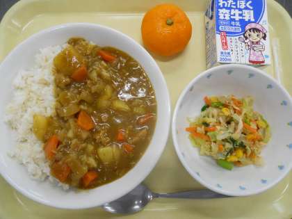 <献立> カレーライス 彩野菜とツナのサラダ みかん