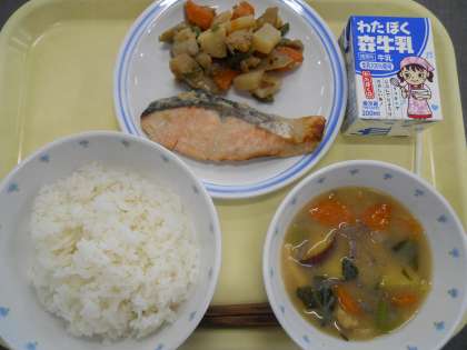 <献立> ご飯 鮭の西京焼き 筑前煮 さつま汁