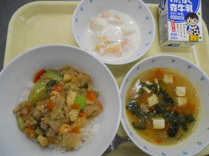 <献立> 中華丼  春雨スープ  フルーツヨーグルト