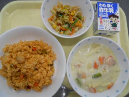 今日の給食には、春が旬のアスパラガスを使用しています。アスパラガスは、緑黄色野菜の一つで実は栄養豊富な野菜です。特に疲労回復効果のあるアスパラギン酸という栄養素を含んでいます。チキンライスは米を炊く時にもトマトケチャップを一緒に炊き込んでいるので米に色や味が絡んでいます。