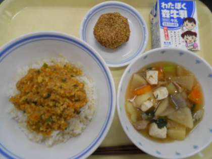 <献立> 肉味噌丼 けんちん汁 さつま芋のごま団子