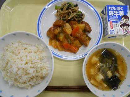 4月24日献立 公開日 2024/04/24 更新日 2024/04/24 給食 <献立> ご飯 かつおの酢豚 おかか和え 味噌汁 <産地>生姜(高知県)、にんにく(青森県)、ピーマン(茨城県)、人参(新潟県)、玉ねぎ(北海道)、じゃが芋(鹿児島県)、もやし(静岡県)、小松菜(東京都)、長ねぎ(埼玉県)、かつお(日本近海) 今日は「かつお」を使った酢豚です。下味をつけて揚げているので、柔らかく、魚と言わなければ分からないかもしれません。かつおは赤身の魚で、摂りにくい鉄分が豊富です。 いいね(0)