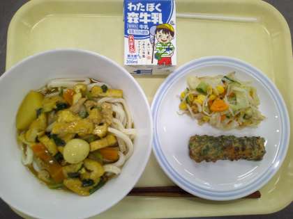 8月29日献立 公開日 2024/08/29 更新日 2024/08/29 給食 <献立> カレーうどん ちくわの磯部揚げ 味噌ドレッシングサラダ <産地> 玉ねぎ(北海道)、人参(北海道)、じゃが芋(北海道)、小松菜(埼玉県)、長ネギ(長野県)、きゅうり(岩手県)、キャベツ(群馬県)、もやし(千葉県)、豚肉(鹿児島県) いいね(0)