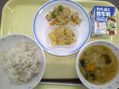 <献立> ごまご飯 肉野菜炒め じゃが芋のチーズ焼き 具だくさん味噌汁