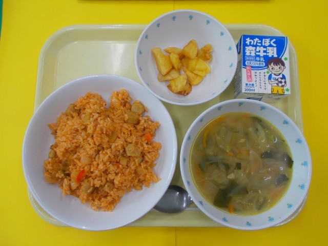 えび(インド) いか(ペルー) あさり(中国) にんにく(青森) 玉ねぎ・人参・じゃがいも(北海道) ピーマン(茨城) 小松菜(埼玉) キャベツ(群馬) 赤ピーマン(高知) 鶏がら(宮崎)