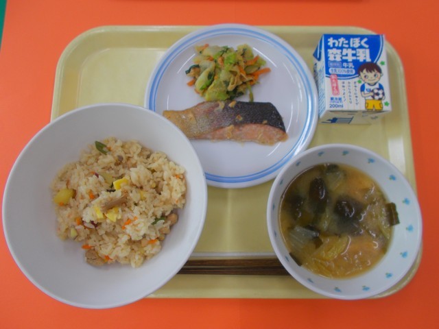 油揚げ(佐賀・カナダ) 栗(愛媛) 鶏もも肉(山梨) 鮭・人参(北海道) しめじ(長野) さつまいも(千葉) さやいんげん(茨城) しょうが(高知) にんにく・長ねぎ(青森) キャベツ(群馬) 小松菜(東京)