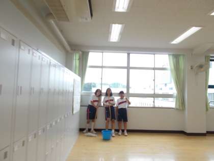 机と椅子を廊下に出して、教室の床をピカピカに磨きました。