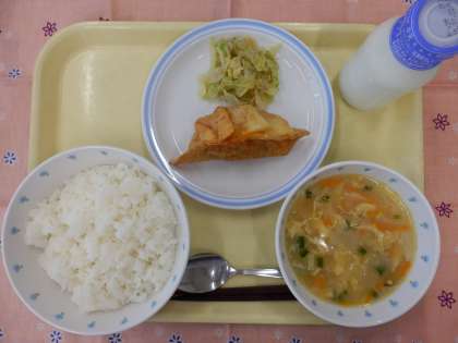今日の献立は、ご飯、チリコンカン揚げ餃子、中華風キャベツ、中華風コーンスープ、牛乳でした。