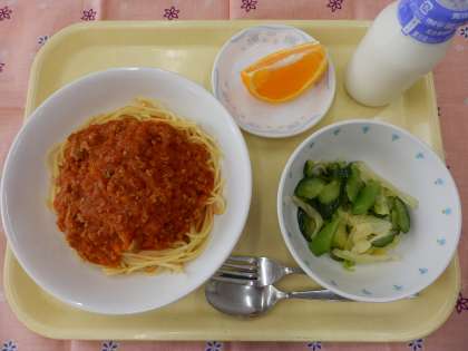 今日の献立は、スパゲッティミートソース、グリーンサラダ、でこぽん、牛乳でした。