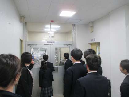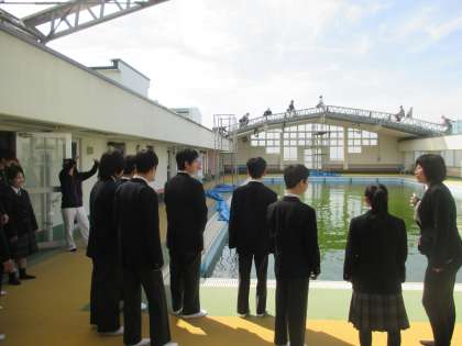 5組は、校内巡りを行い、現在屋根を工事中の屋上プールにも行きました。頼もしい先輩たちが1年生に、ていねいに校内の様々な場所を紹介していました。