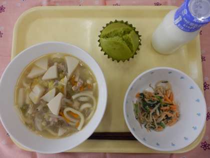 今日の献立は、ちゃんぽんうどん、高野和え、抹茶蒸しパン、牛乳でした。