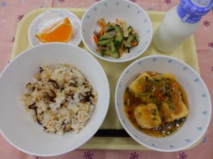 今日の献立は、昆布ご飯、揚げ豆腐の野菜あんかけ、大根とひじきのサラダ、デコポン、牛乳でした。