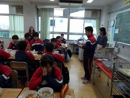 給食準備の様子です。1年生の給食準備もだいぶ慣れてきて早くなってきました。しかし、3年生はそれよりもっと手際よく素早くやっています。毎日おいしい給食をいただいています。感謝です。