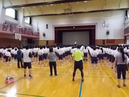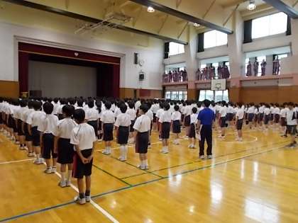 運動会全体練習は、雨天のため、体育館で実施しました。生徒の実行委員長より全生徒に、運動会成功に向けて、意気込みを発信しました。