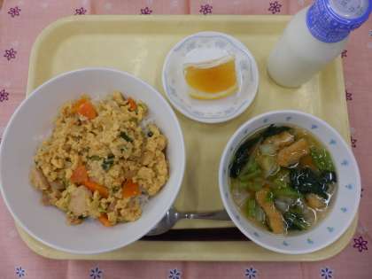 今日の献立は、親子丼、吉野汁、美生柑、牛乳でした。