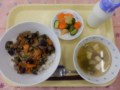 今日の献立は、麻婆なす丼、わかめスープ、カクテキ、牛乳でした。