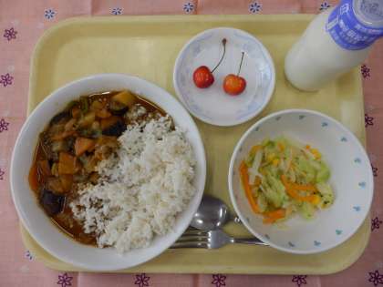 今日の献立は、夏野菜カレーライス、コールスローサラダ、さくらんぼ、牛乳でした。