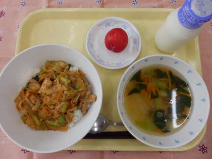 今日の献立は、ケイチャン丼、糸寒天のスープ、プラム、牛乳でした。