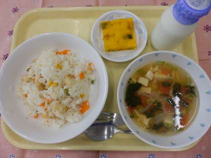 今日の献立は、シーフードピラフ、トマトとたまごのスープ、パンプキンケーキ、牛乳でした。