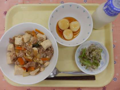 今日の献立は、肉豆腐丼、キャベツのゆかり和え、月見団子、牛乳でした。