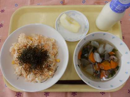 今日の献立は、鮭寿司、鶏ごぼう汁、りんご、牛乳でした。