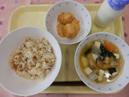 今日の献立は、里いもとひき肉のご飯、けんちん汁、ミルクくずもち、牛乳でした。